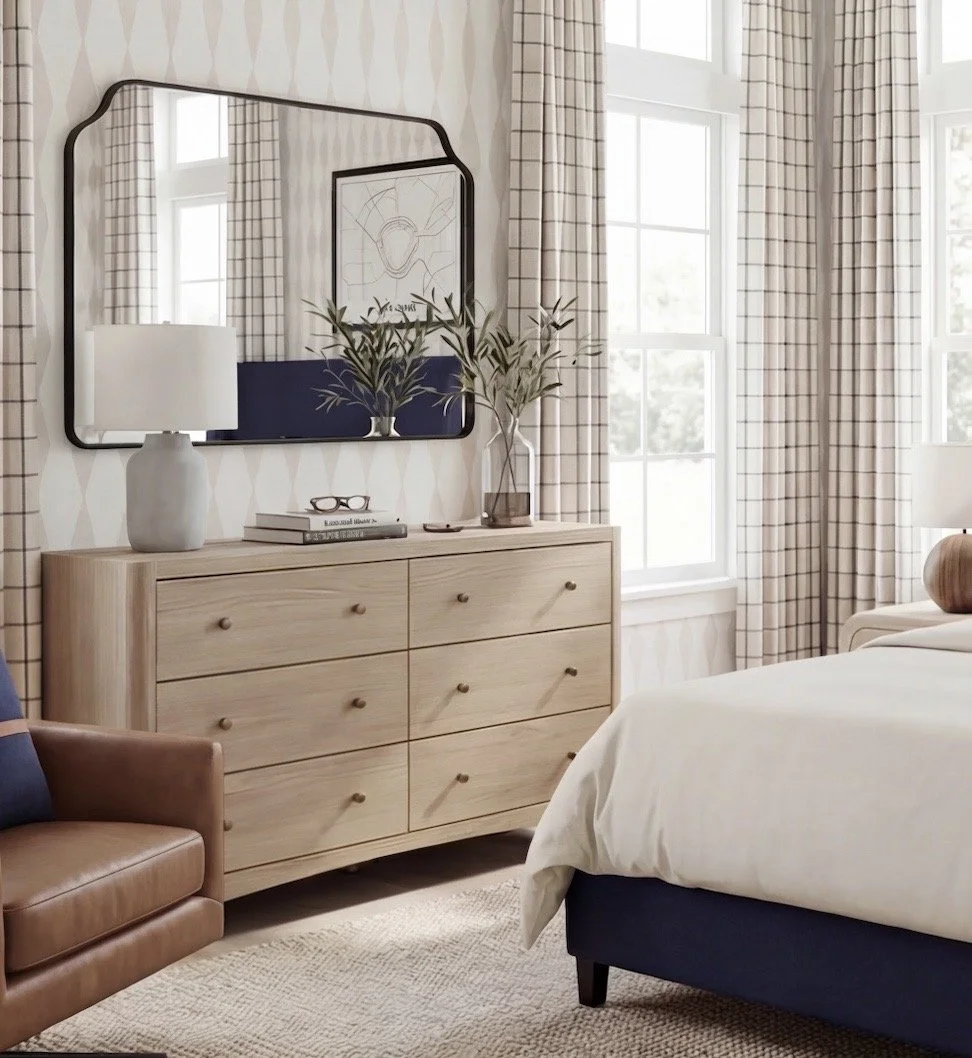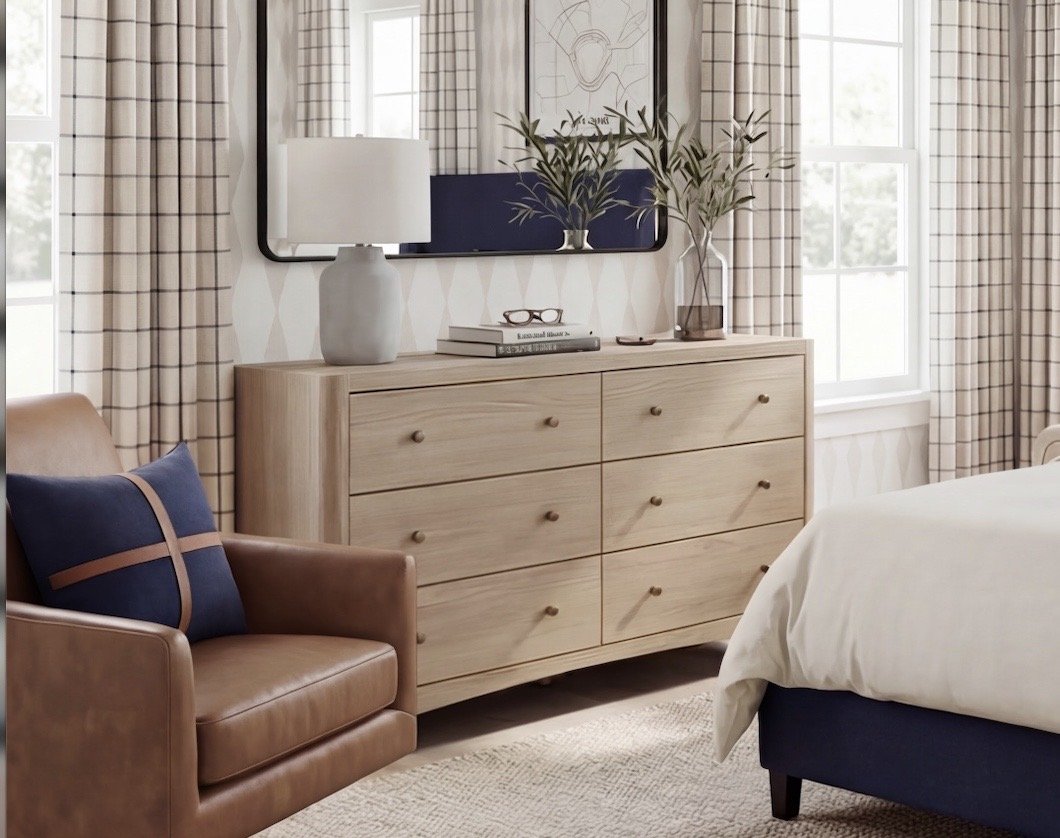 Normally, I don’t gravitate toward matching dresser and nightstand sets — but I sourced a curved option from Wayfair that reflects the elevated, softened shape shown here.