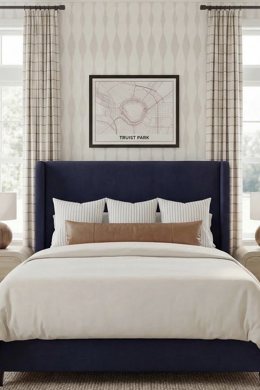 The bed in this design is styled with a tailored upholstered silhouette similar to the Tilly style available through Wayfair — a shape I come back to again and again. The lines are clean and classic, and one of the biggest advantages of this style is the fabric flexibility.