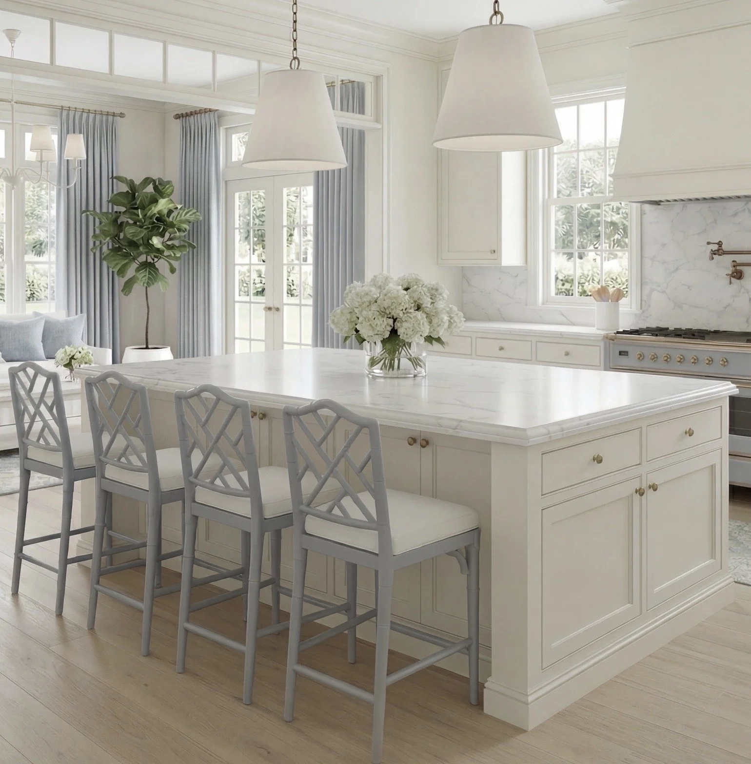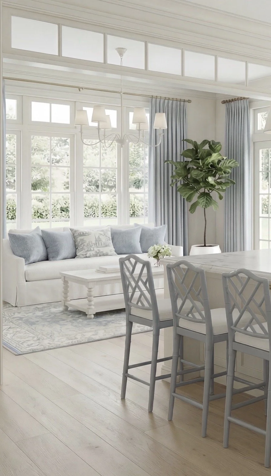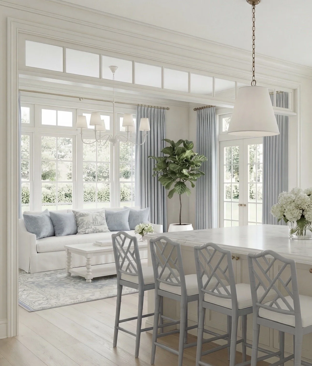 The open sightline into the sitting area makes this feel like a true gathering space—not just a kitchen. The repeated tones (soft blues, warm whites) keep everything cohesive.