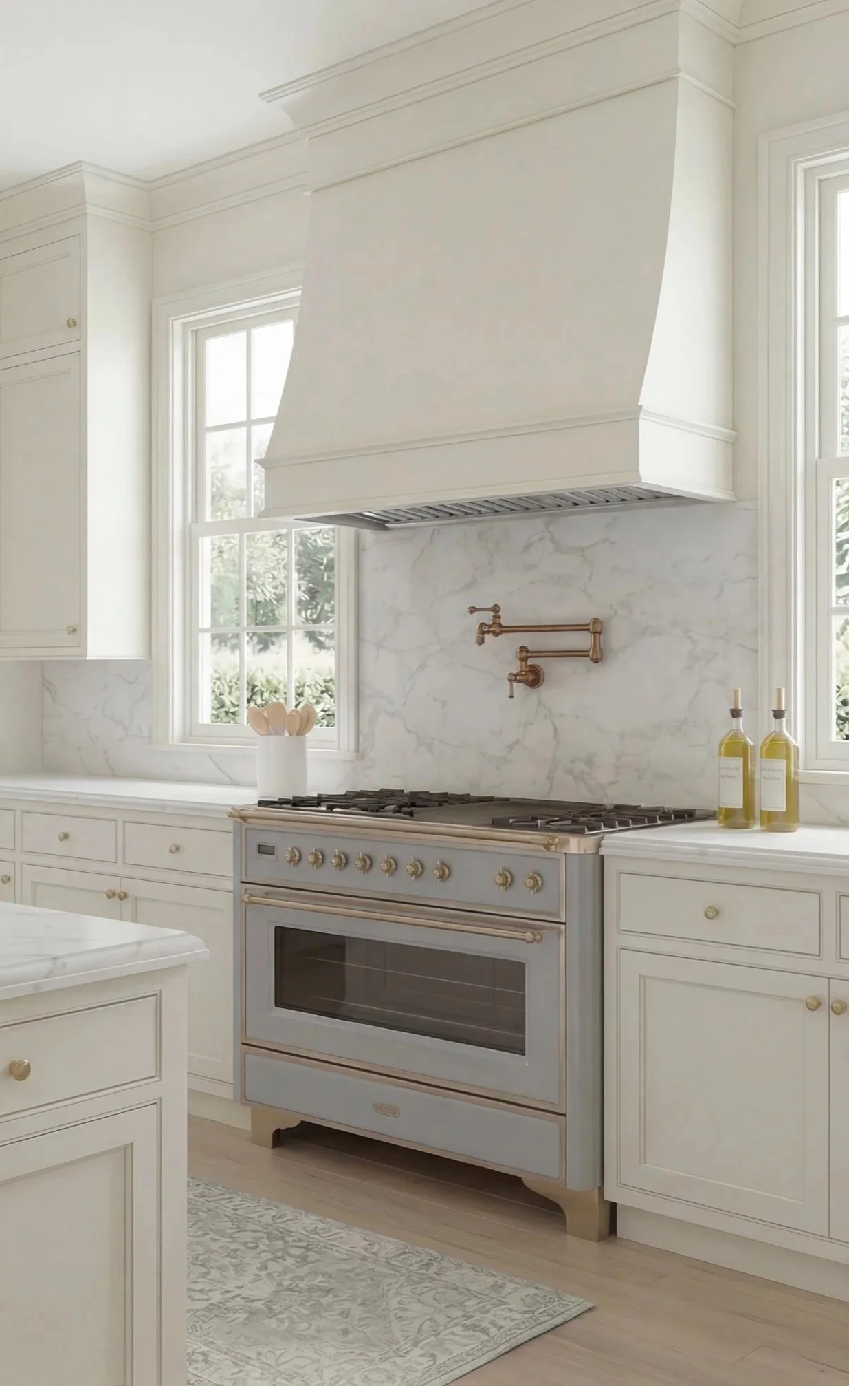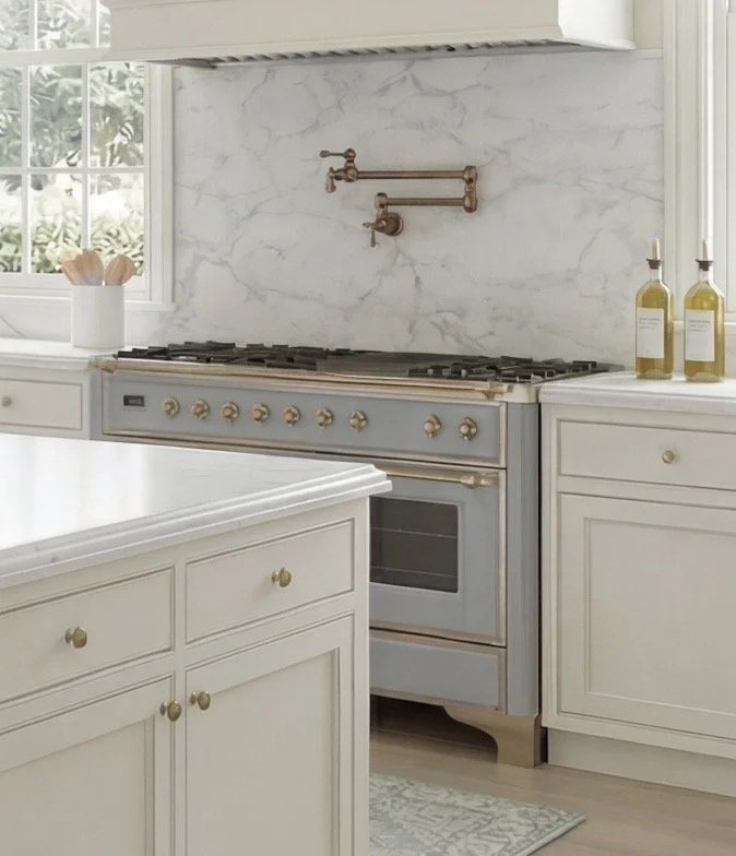 From the custom hood to the bridge faucet to the cabinetry details, this is rooted in classic design. But the light finishes and simplified styling keep it from feeling formal or dated.