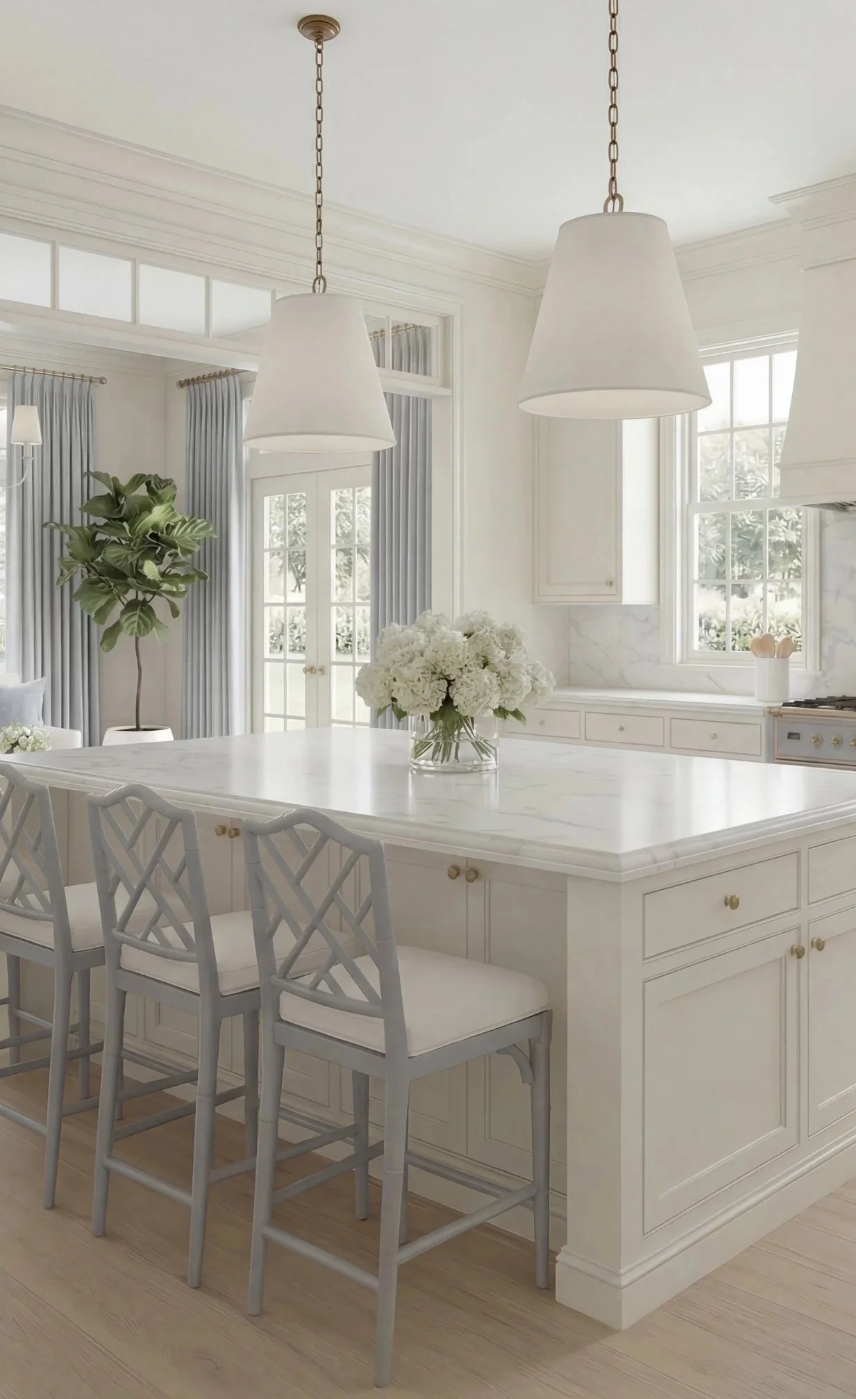 Creamy cabinetry, soft marble veining, warm wood floors, and those muted blue accents all play together in a way that feels layered—not one-note.