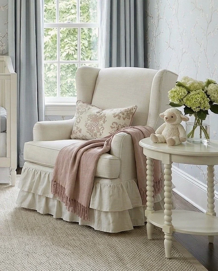Soft blue is one of those colors that instantly creates a sense of calm—and in a nursery, that matters. Paired with traditional details and just a hint of blush, it creates a space that feels both timeless and gently feminine without ever leaning overly sweet.