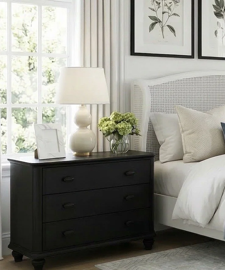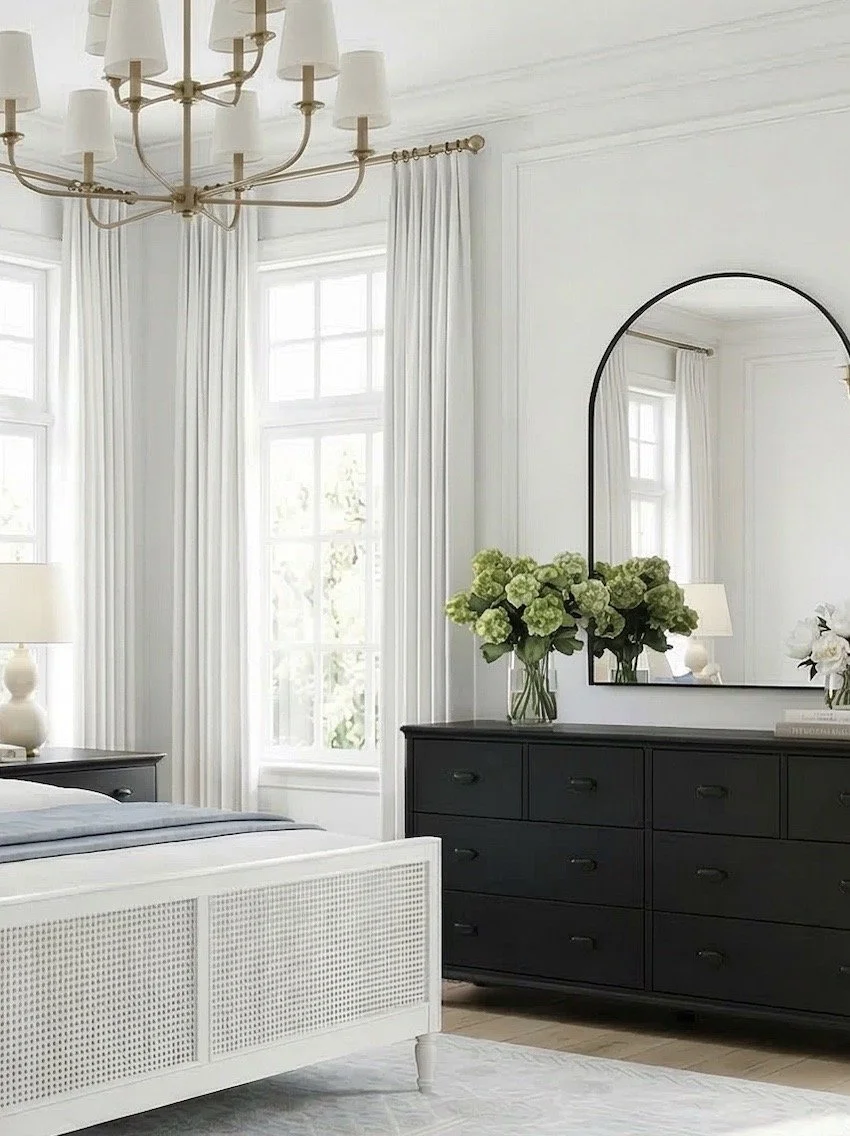 I love incorporating darker wood tones in a light space — it adds contrast and keeps everything from feeling too one-note. This 9-drawer dresser is a standout piece that brings a strong, traditional presence, and the matching nightstands tie everything together beautifully.