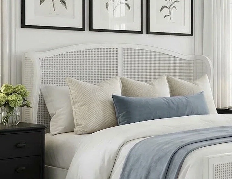 A beautiful, light and airy bed with woven detailing that adds texture while keeping the space feeling classic and refined.