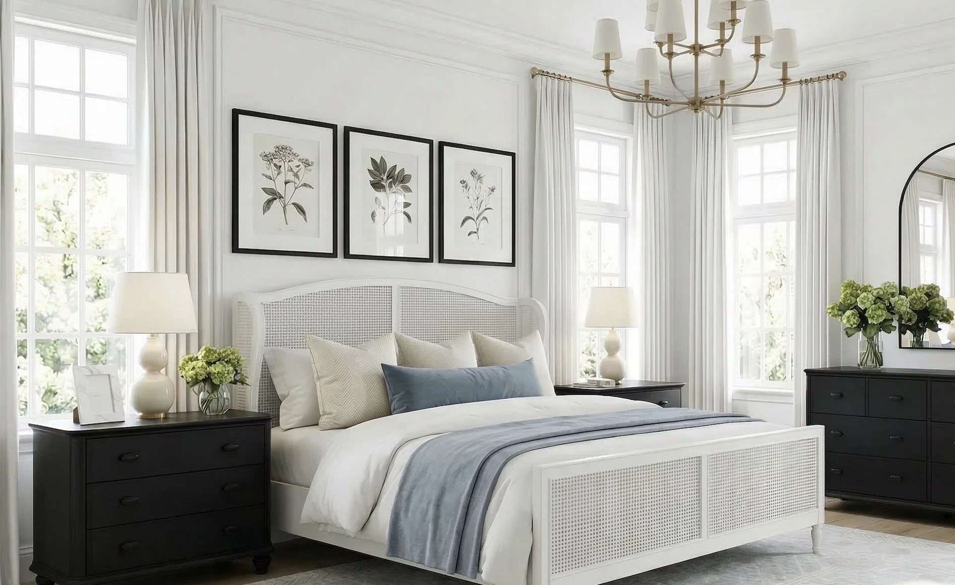 A Bright & Timeless Bedroom with Classic Blue Accents