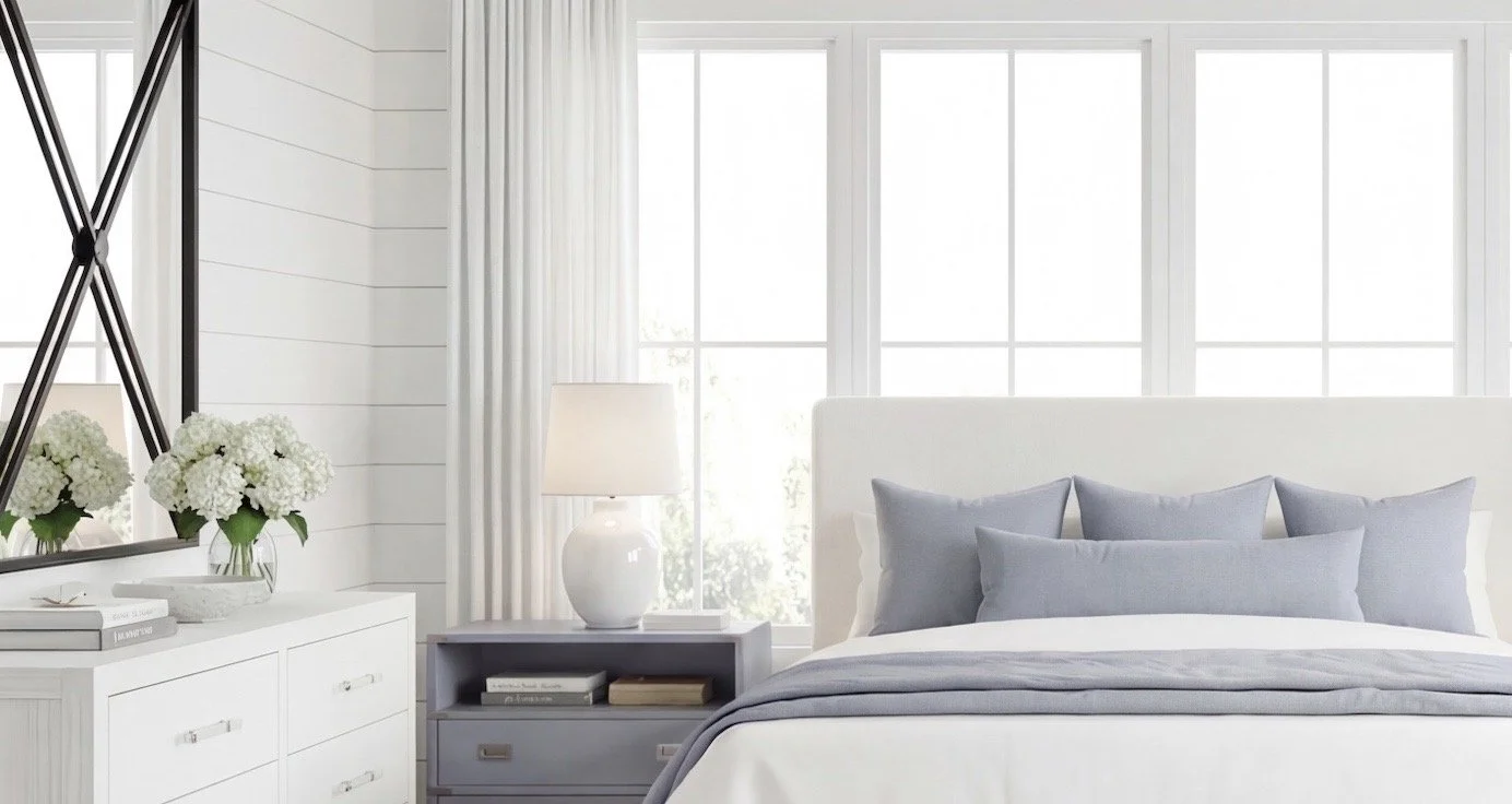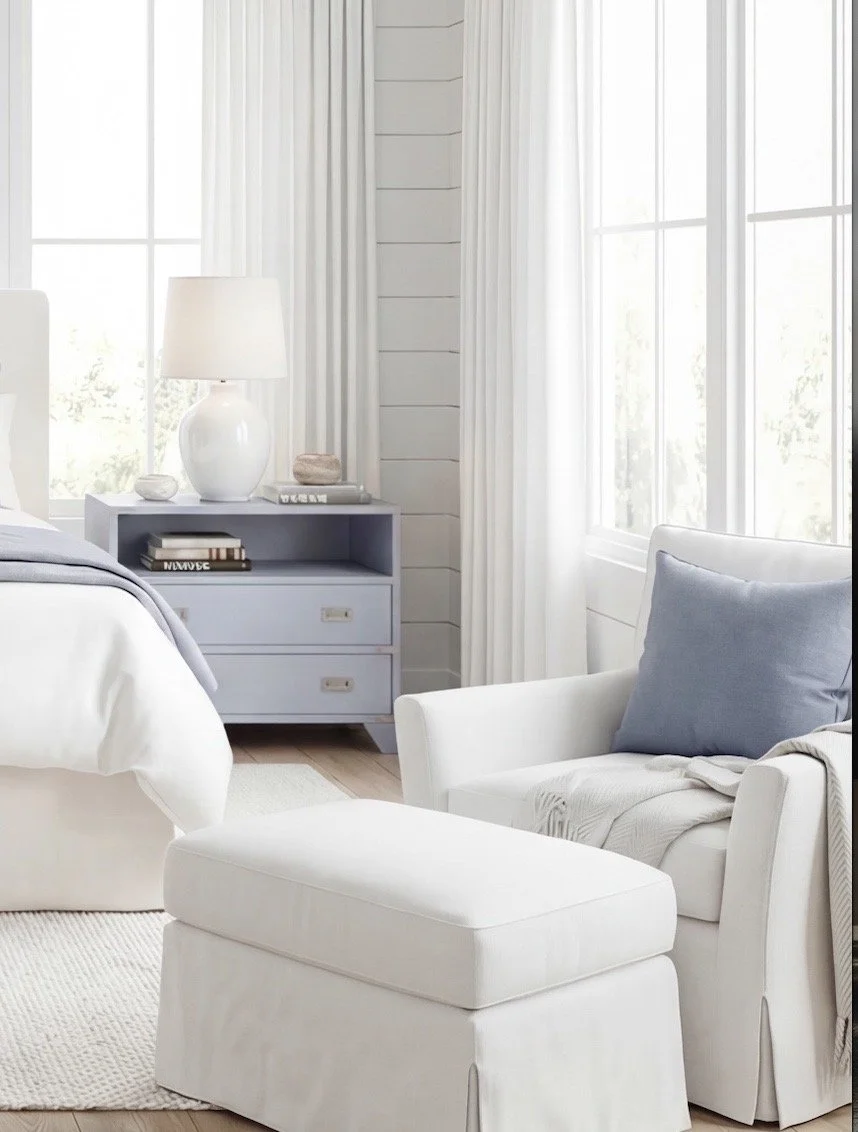 To maintain the calm, restorative feel, I leaned into bright white bedding and simple drapery. The linen-look panels I linked from Two Pages (via Amazon) mirror the soft texture used in this concept. Nothing fussy. Nothing competing. Just clean, tailored lines that frame the room and add quiet dimension.