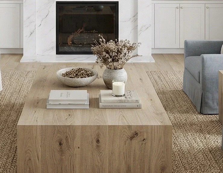 Light oak flooring + coffee table bring in warmth (this is key—keeps the room from feeling cold)