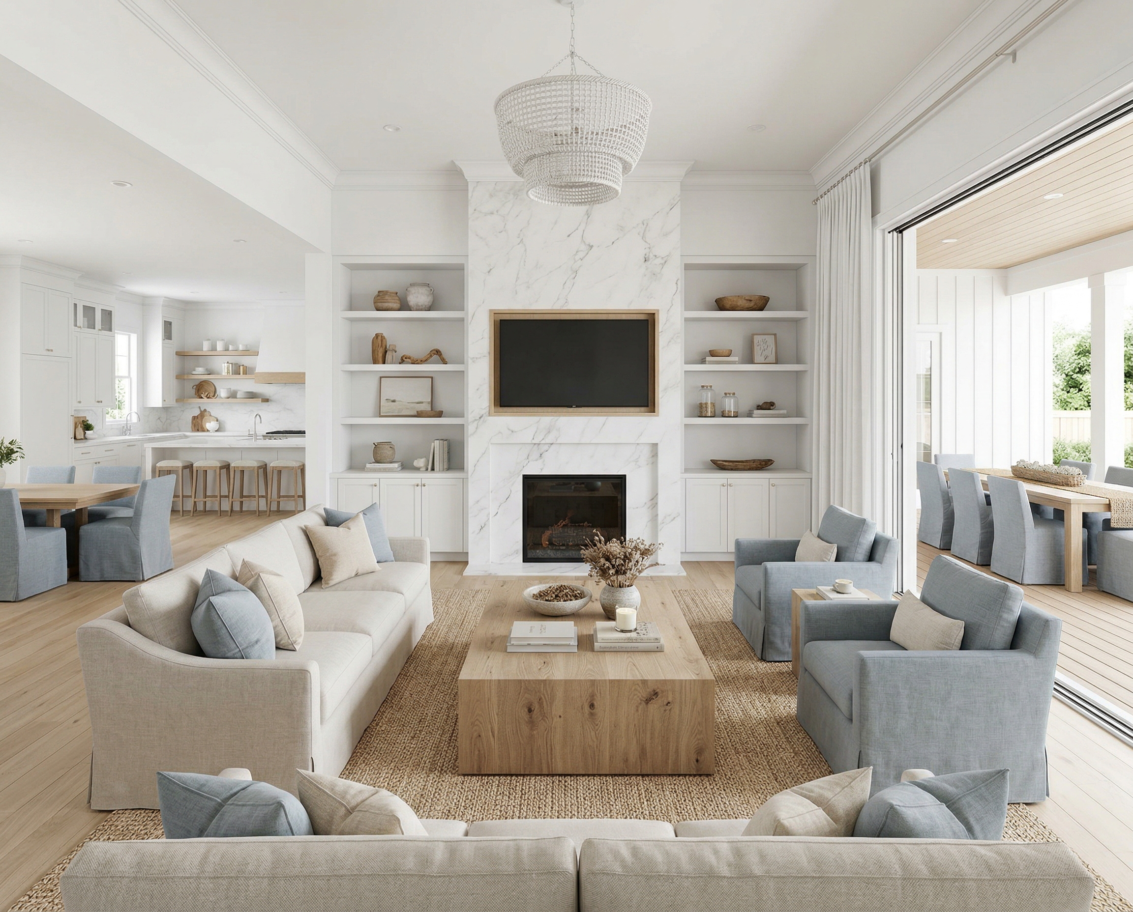 This space is the perfect blend of coastal calm and classic structure—layered neutrals, soft blue accents, and warm wood tones that keep everything from feeling too stark.