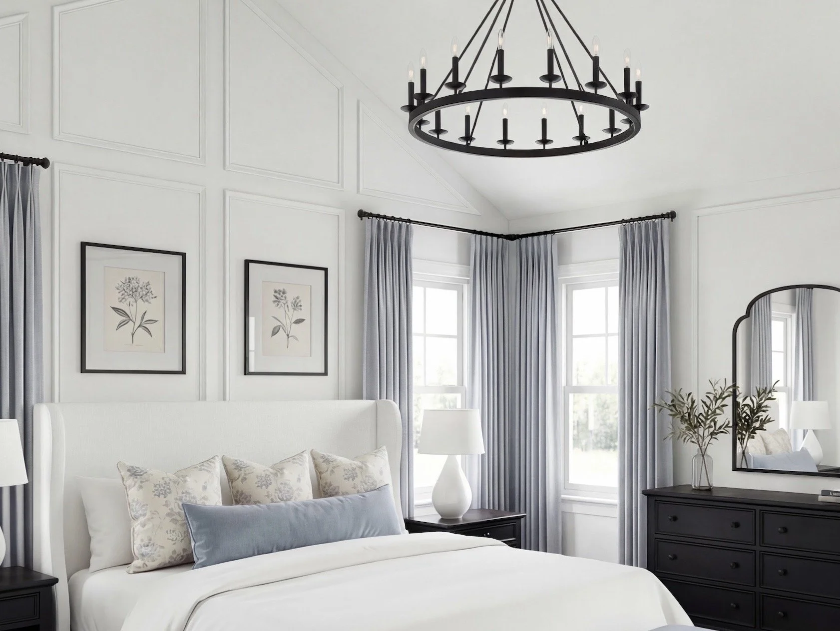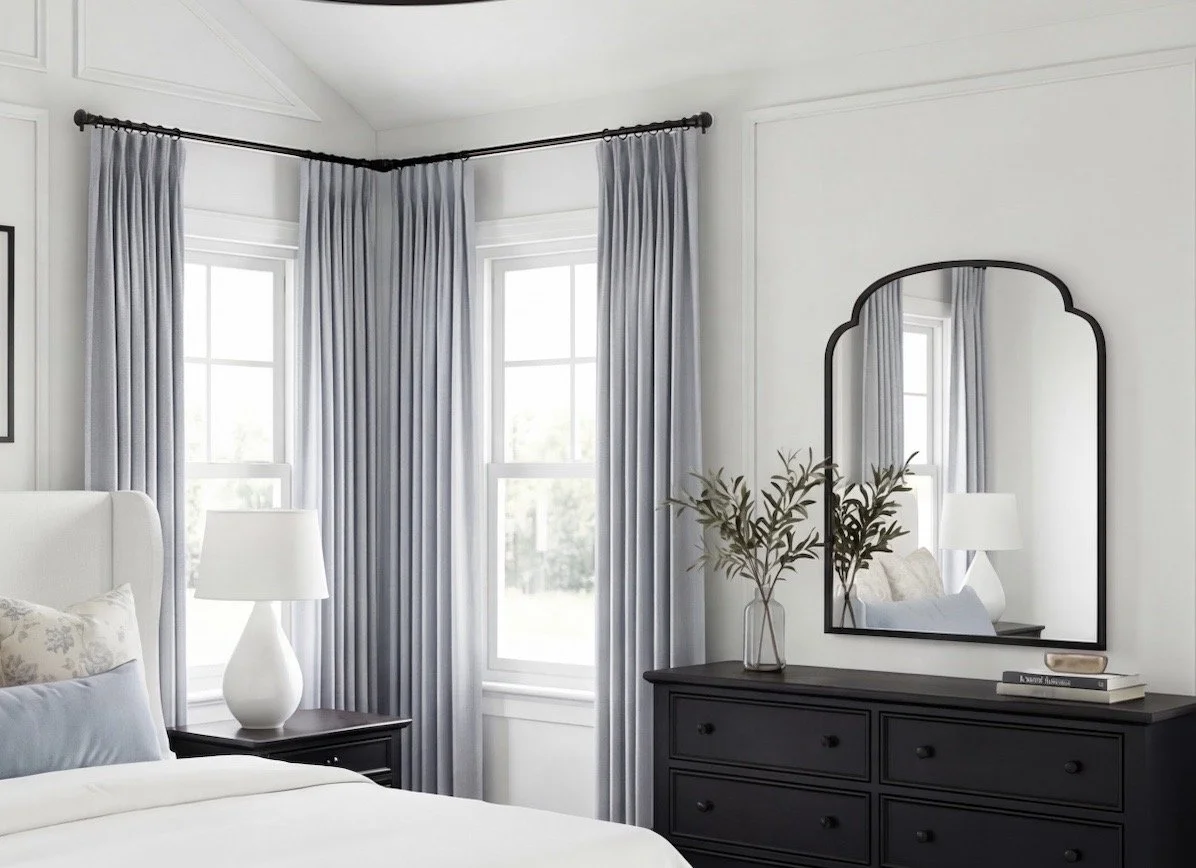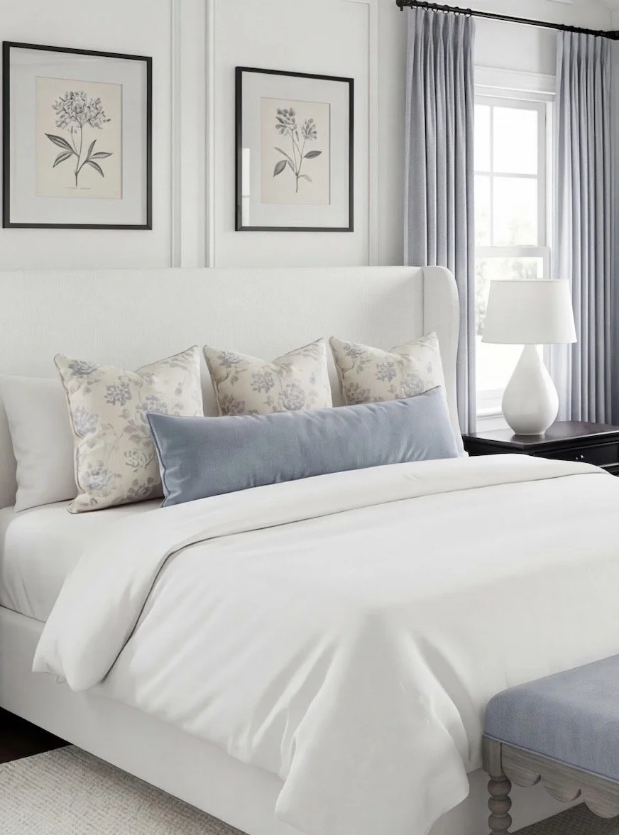 For this concept, I started with the draperies — and everything else followed. The panels I linked are Two Pages (via Amazon) in the color Winter Sky — one of my all-time favorites. That soft, muted blue instantly sets the tone. Calm, tailored, and quietly elegant.