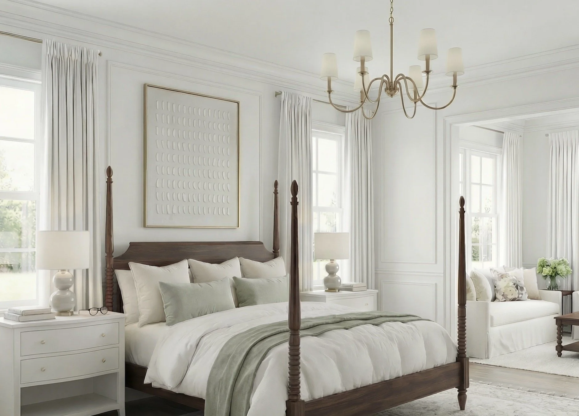 The result is a primary bedroom that feels timeless, layered, and incredibly peaceful.