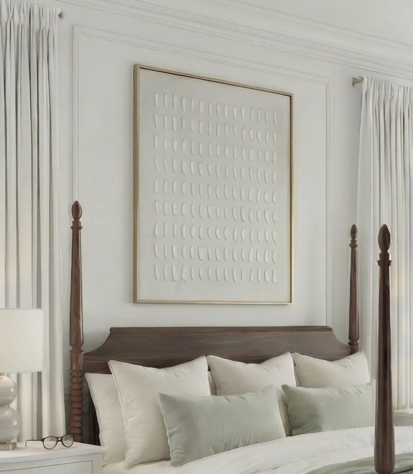 Neutral lamps with soft ceramic bases bring in a bit of sculptural detail without overwhelming the space. Above the bed, large-scale artwork adds subtle texture while keeping the overall palette cohesive.