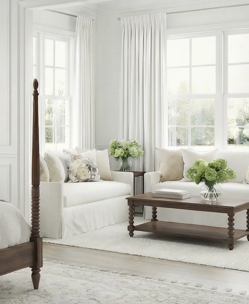 For this room, the inspiration began with a traditional four-poster bed in a warm wood finish. I found a beautiful option from Wayfair that captures this same look — turned posts, substantial wood tones, and a shape that feels both traditional and grounding. It anchors the room while still feeling relaxed and livable.