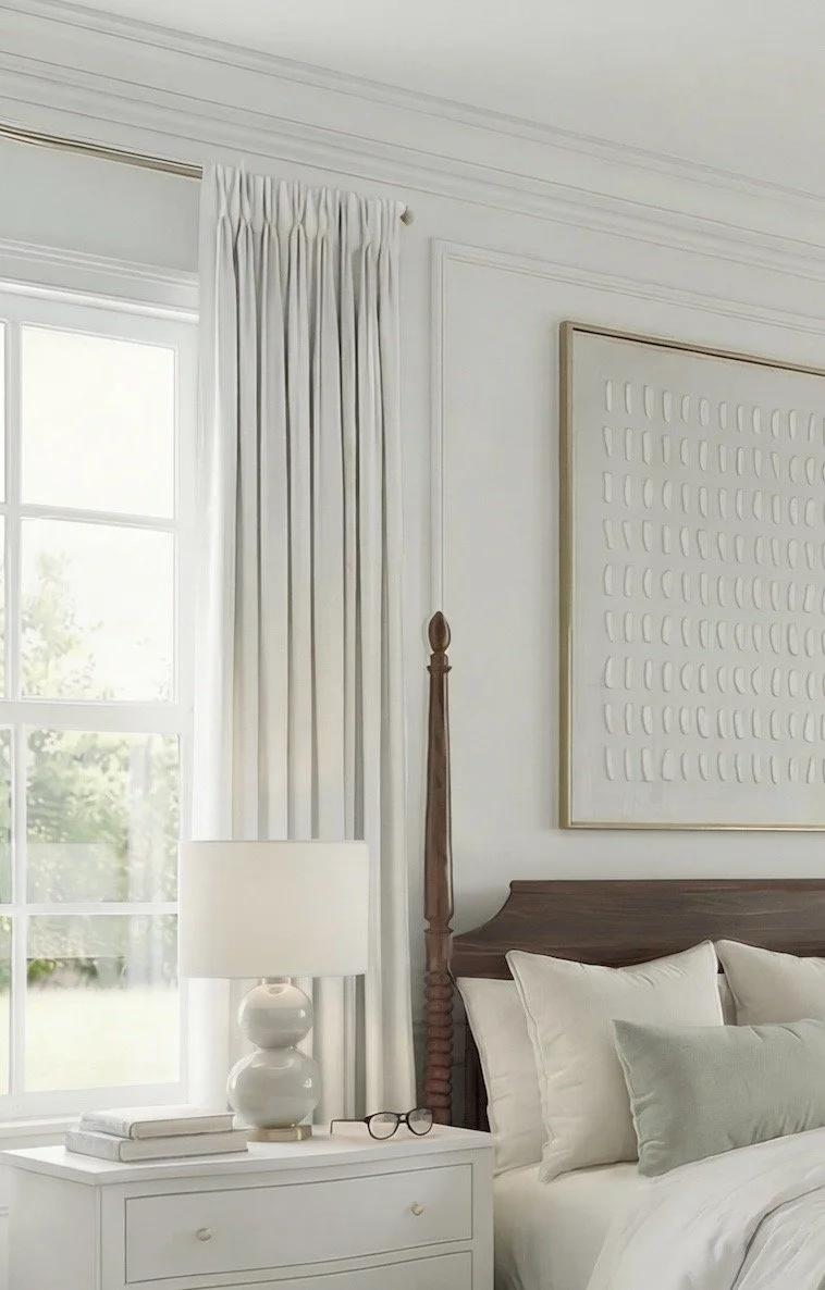 And of course — the draperies are hung high and wide to emphasize the beautiful ceiling height and bring a polished, designer feel to the windows. It’s a small detail that makes a big difference.