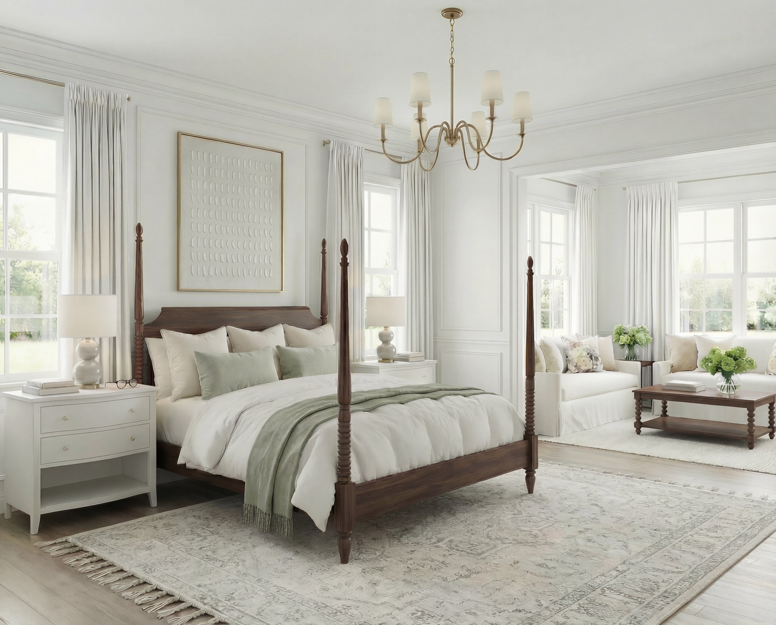 A simple wood coffee table grounds the seating area and adds a bit of warmth, while a neutral area rug helps define the sitting space without competing with the main bedroom rug.
