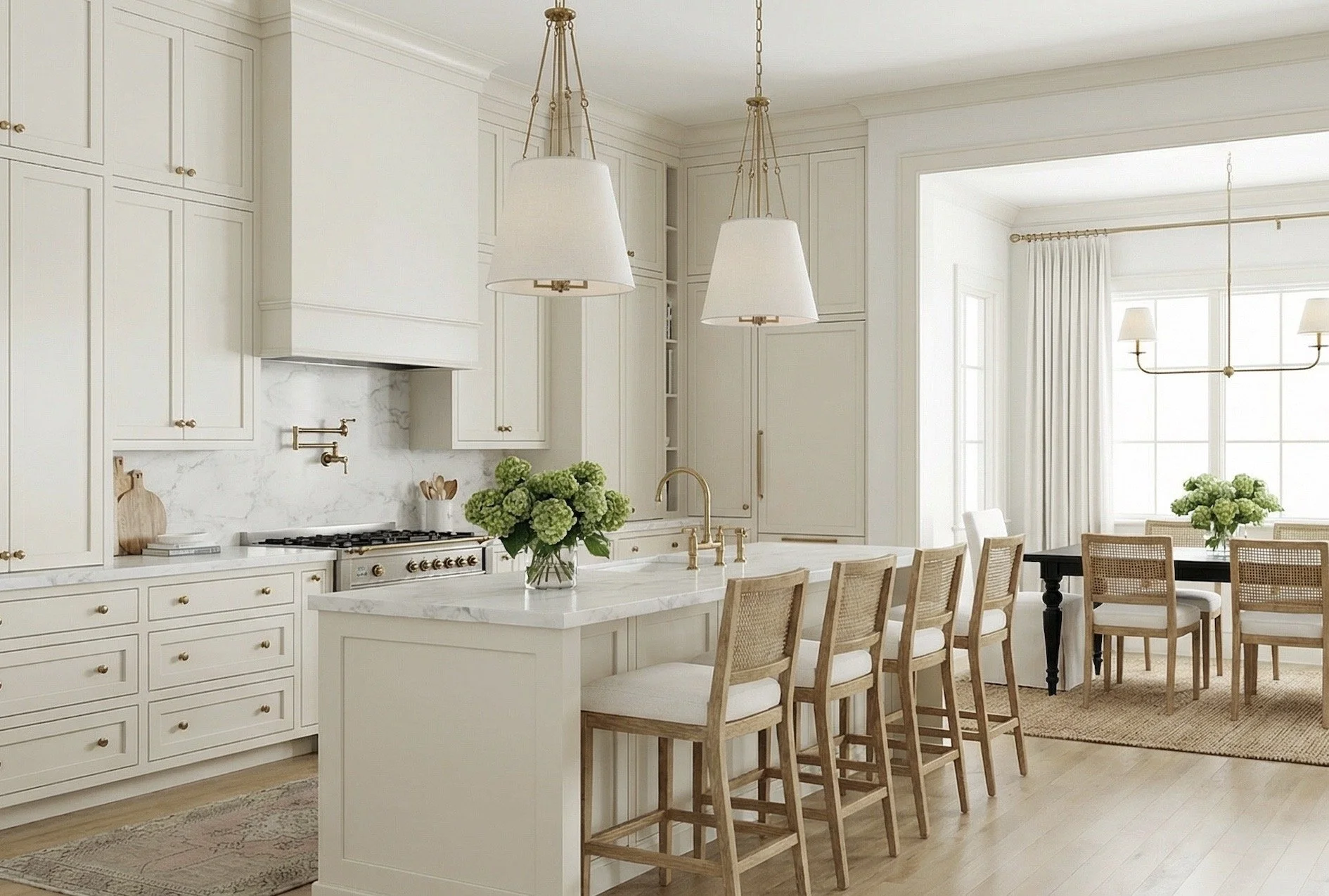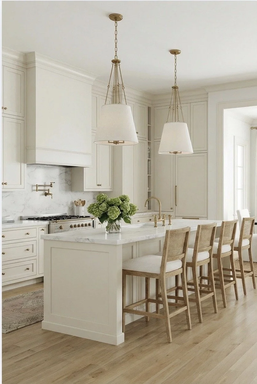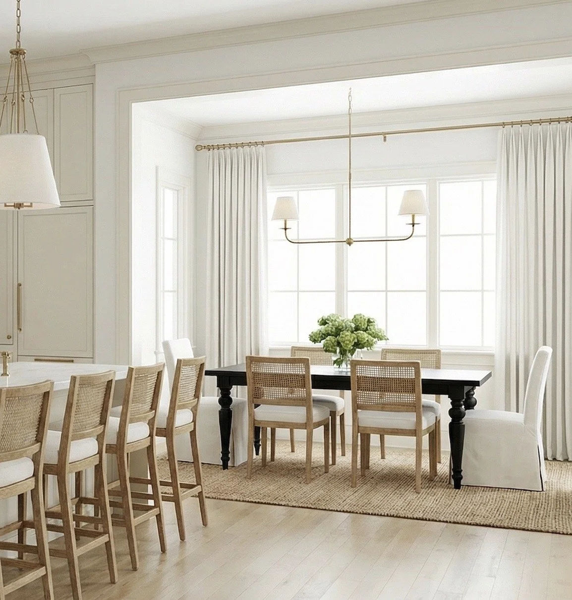 All of the fixtures are from Wayfair, and they strike that perfect balance between classic and updated. The island pendants add height and softness, while the dining light keeps things tailored and symmetrical without feeling too formal.