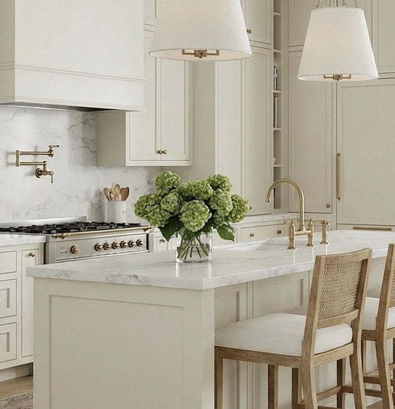 Classic brass pendants with soft white shades that add warmth and elevate the island without feeling too formal.