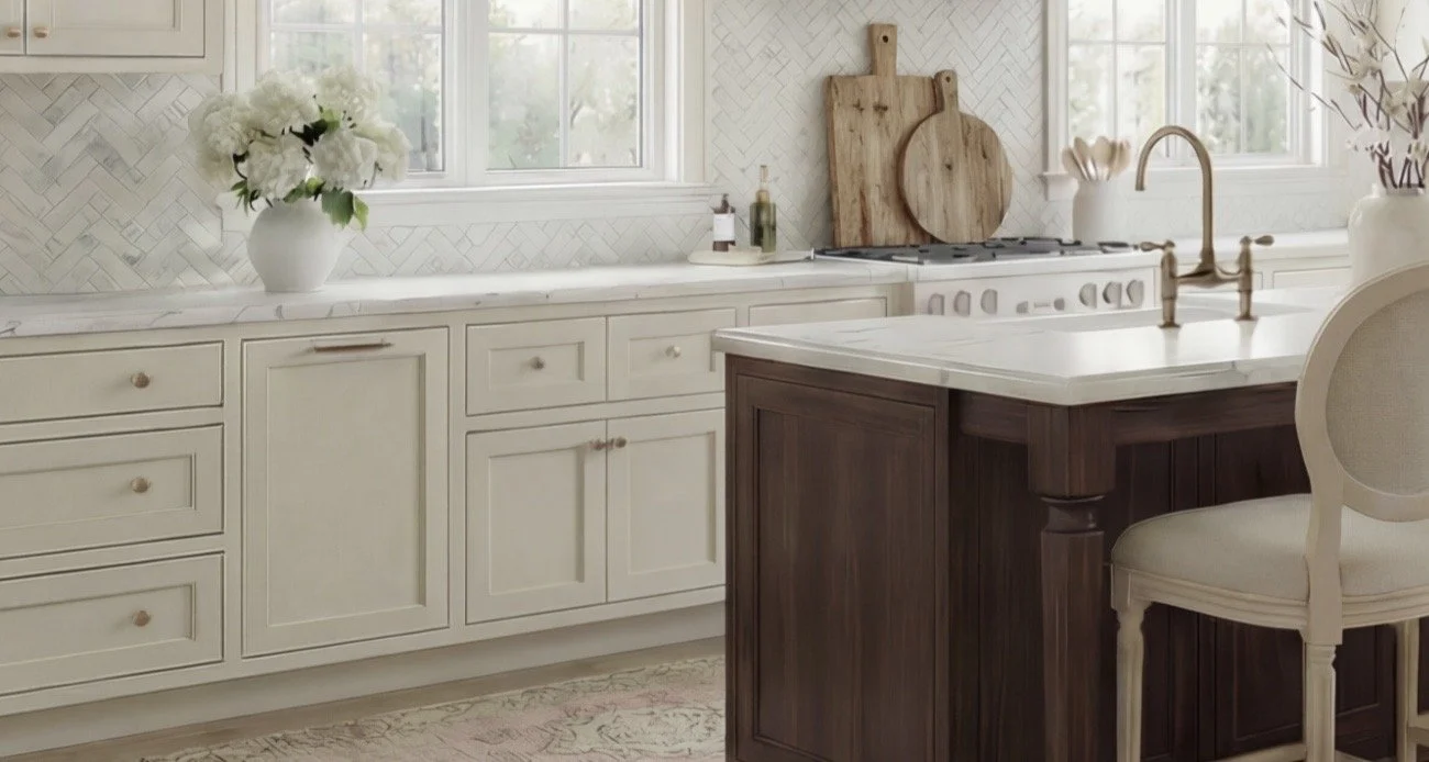 The darker wood tone on the island adds warmth and contrast against the creamy cabinetry, helping the entire room feel layered and collected.