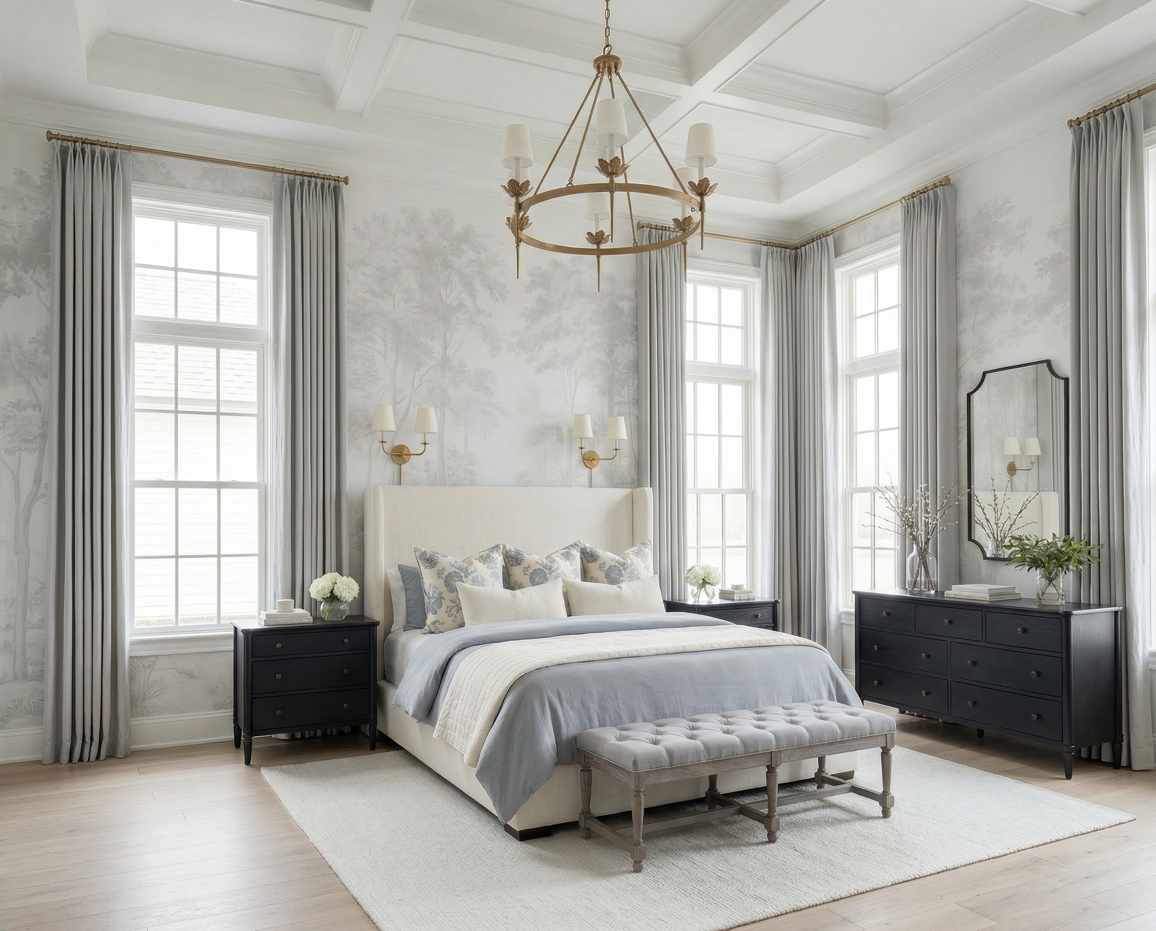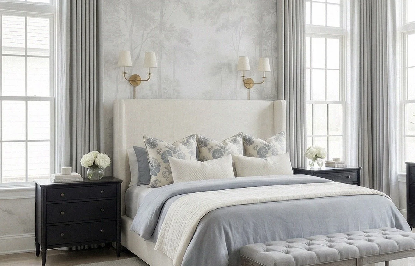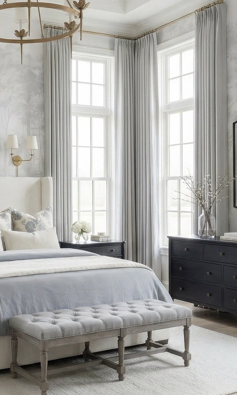 There’s a reason I keep coming back to soft blue bedrooms like this one—they feel calm, tailored, and just a little bit elevated without ever feeling overdone. This space leans into that perfectly with its subtle mural wallpaper, classic silhouettes, and layered neutrals that let the blue accents quietly shine.