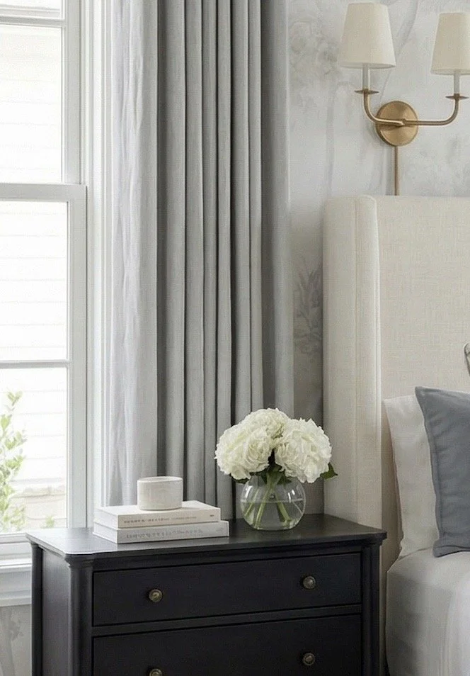 These soft blue-gray pinch pleat panels are doing a lot of heavy lifting. They frame the windows beautifully, draw the eye upward, and add that custom, designer look without needing anything complicated. I’ve linked my favorite Two Pages Liz Linen-Look pinch pleat drapes, this time is the color Fog.