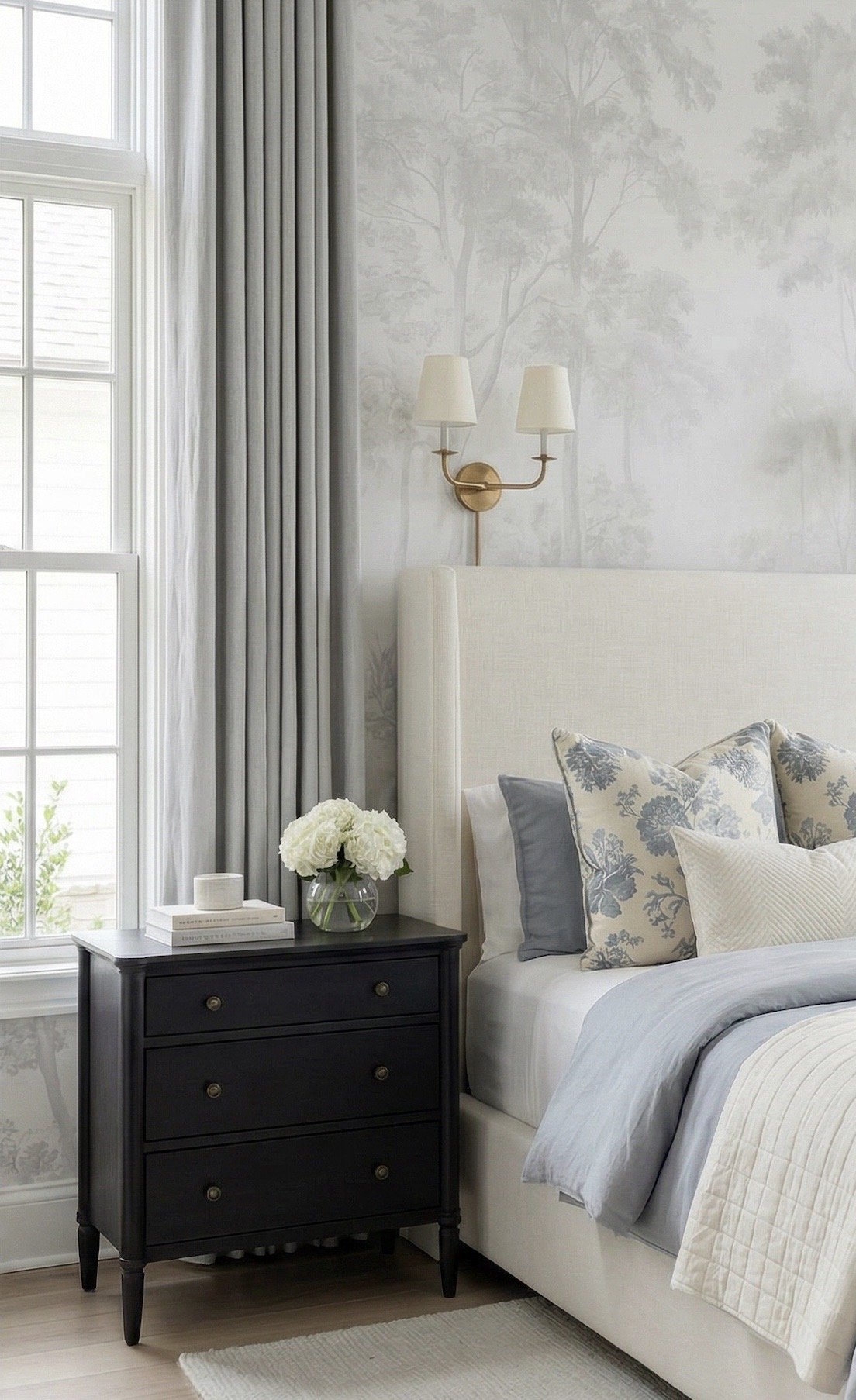 This is what gives the entire room its character. Look for a soft, tonal mural or scenic wallpaper in muted blue-gray tones—something that reads more like a watercolor wash than a bold print.
