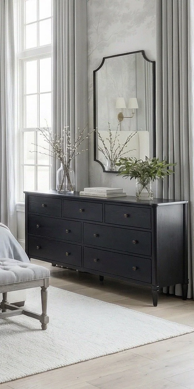 The darker nightstands and dresser ground the space and keep it from feeling too light or washed out. This is what gives the room that collected, layered look instead of something that feels flat.