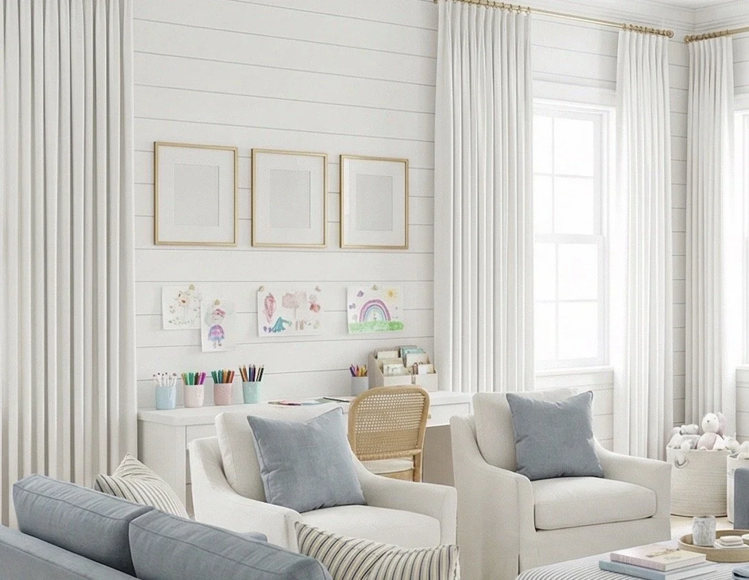 This design focuses on creating a playroom that still feels calm, bright, and pulled together, even when it’s filled with toys, crafts, and little people.