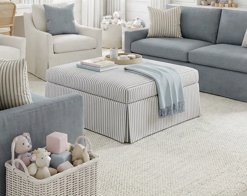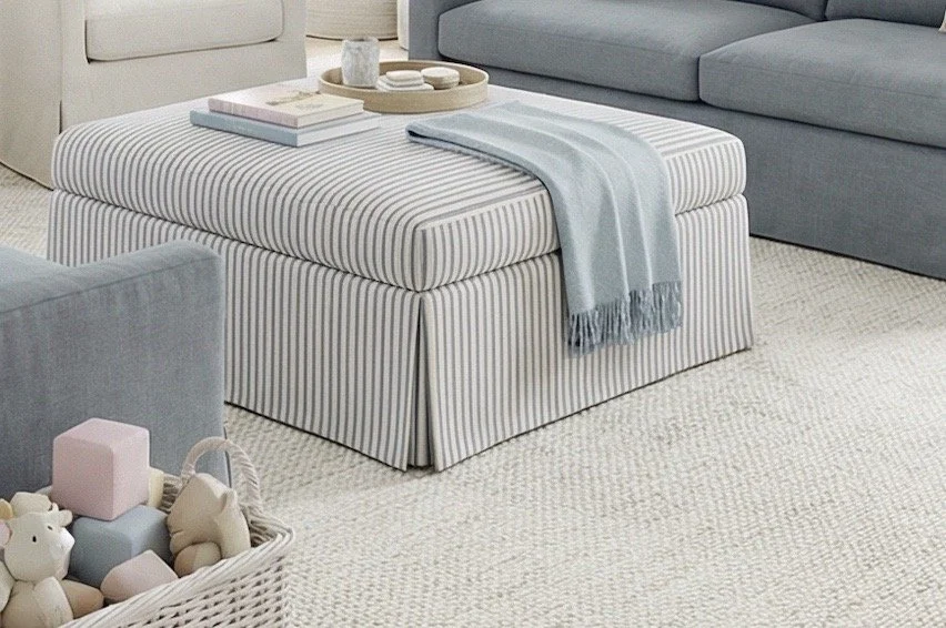 The striped upholstered ottoman works as a coffee table, but it’s also soft enough for kids to climb, sit, or play around safely.