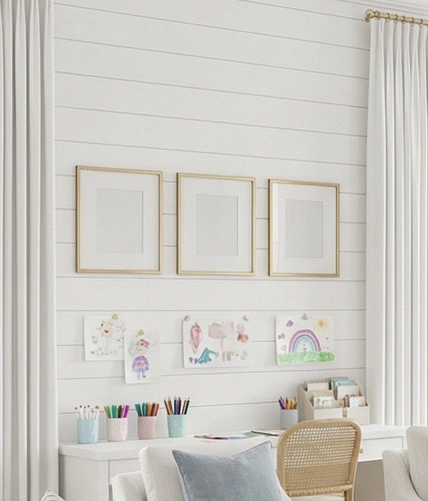 Instead of committing to permanent artwork, this playroom uses a row of simple frames above the craft desk.