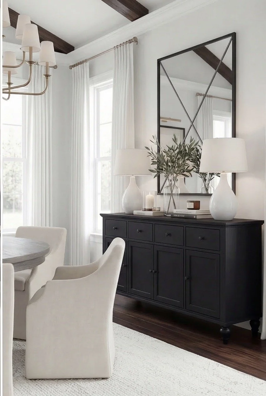 The sideboard shown in this concept is styled as a substantial, traditional piece. I’ve linked a comparable option from Birch Lane that offers that same grounding presence. Flanking it with two lamps — simple Amazon finds — creates symmetry, which just works in a dining room. It feels balanced and intentional without feeling staged.