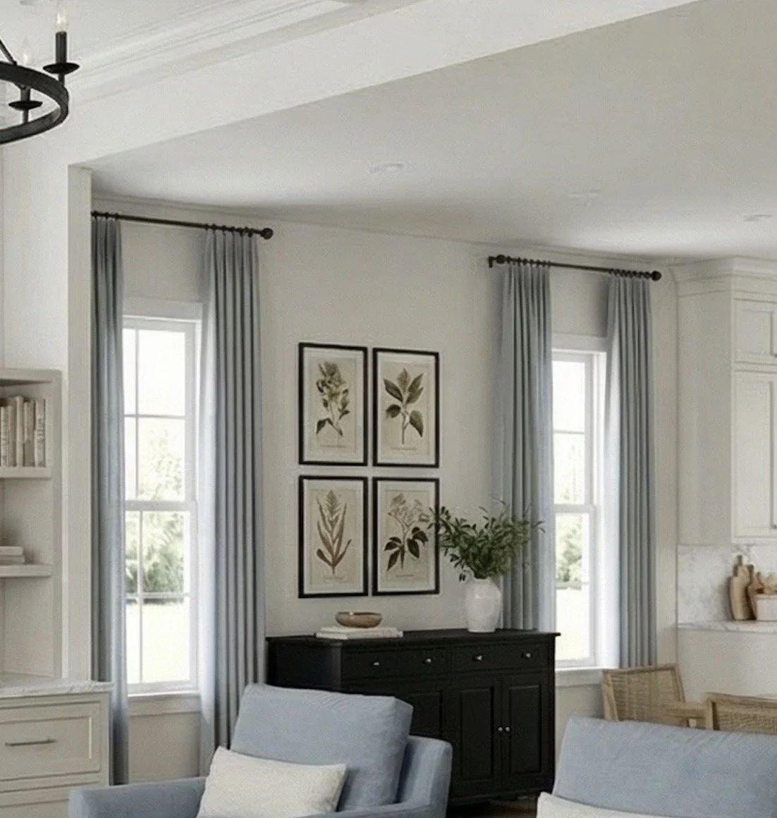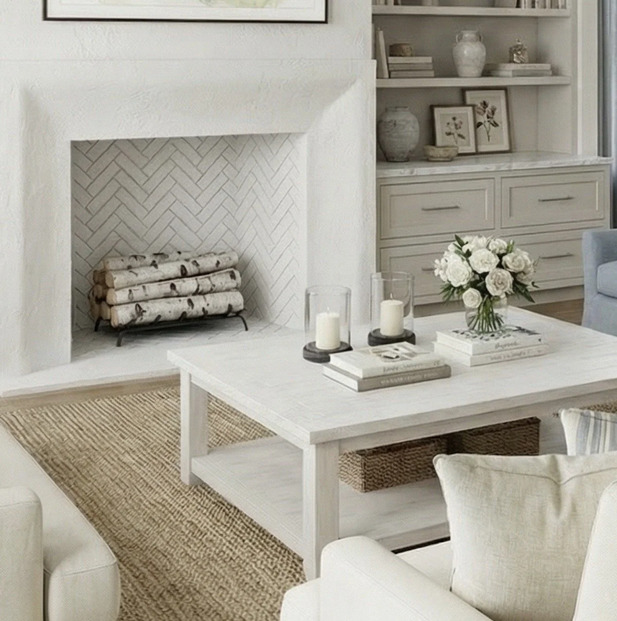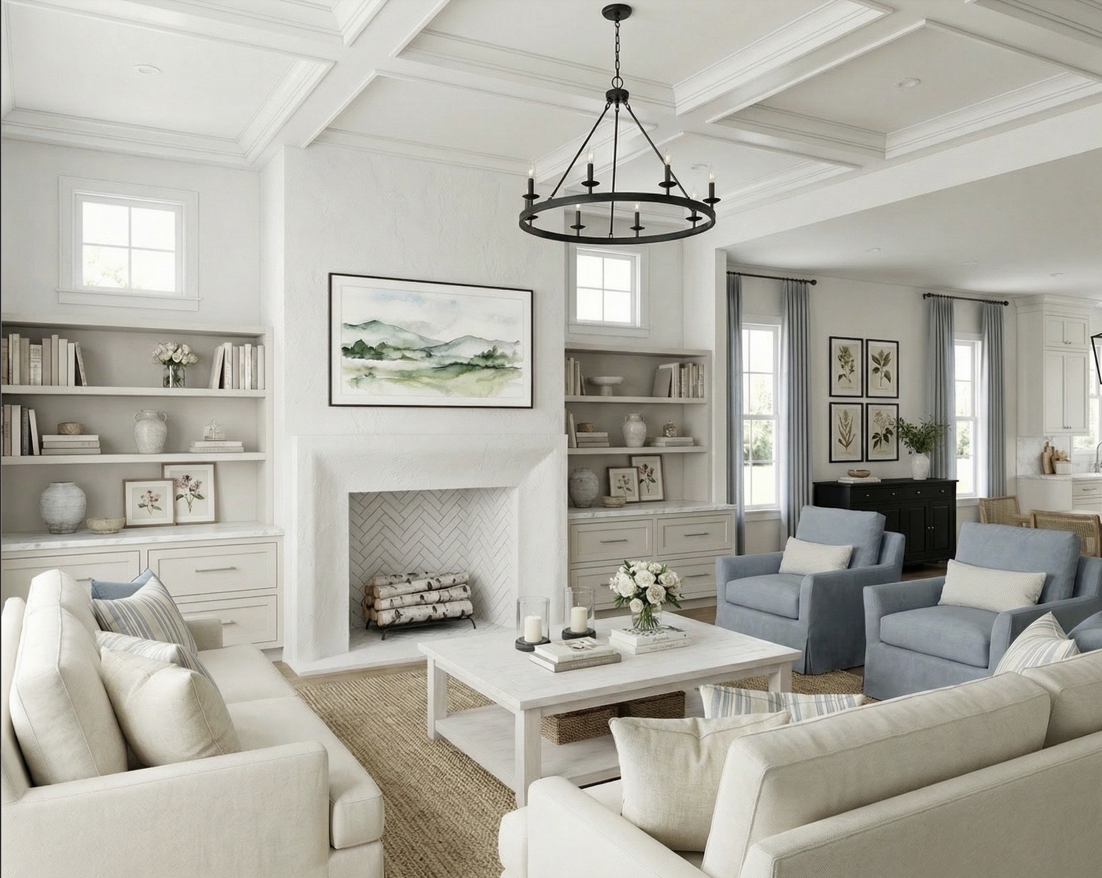 There’s something timeless about a layered neutral room with just a whisper of color. This design leans into creamy upholstery, soft blue accents, and natural texture to create a space that feels collected, calm, and elevated without trying too hard.