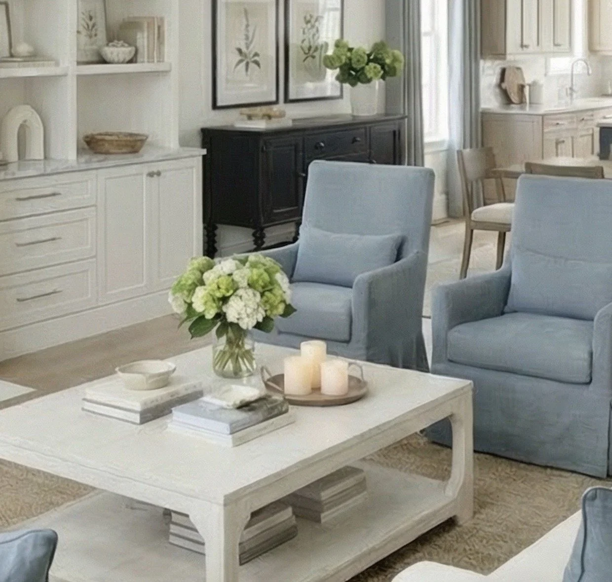 The muted blue accent chairs bring gentle contrast while keeping the palette cohesive. Instead of bold navy or coastal tones, this softer blue feels refined and subtle. The ones I’ve linked are a great find from Birch Lane.