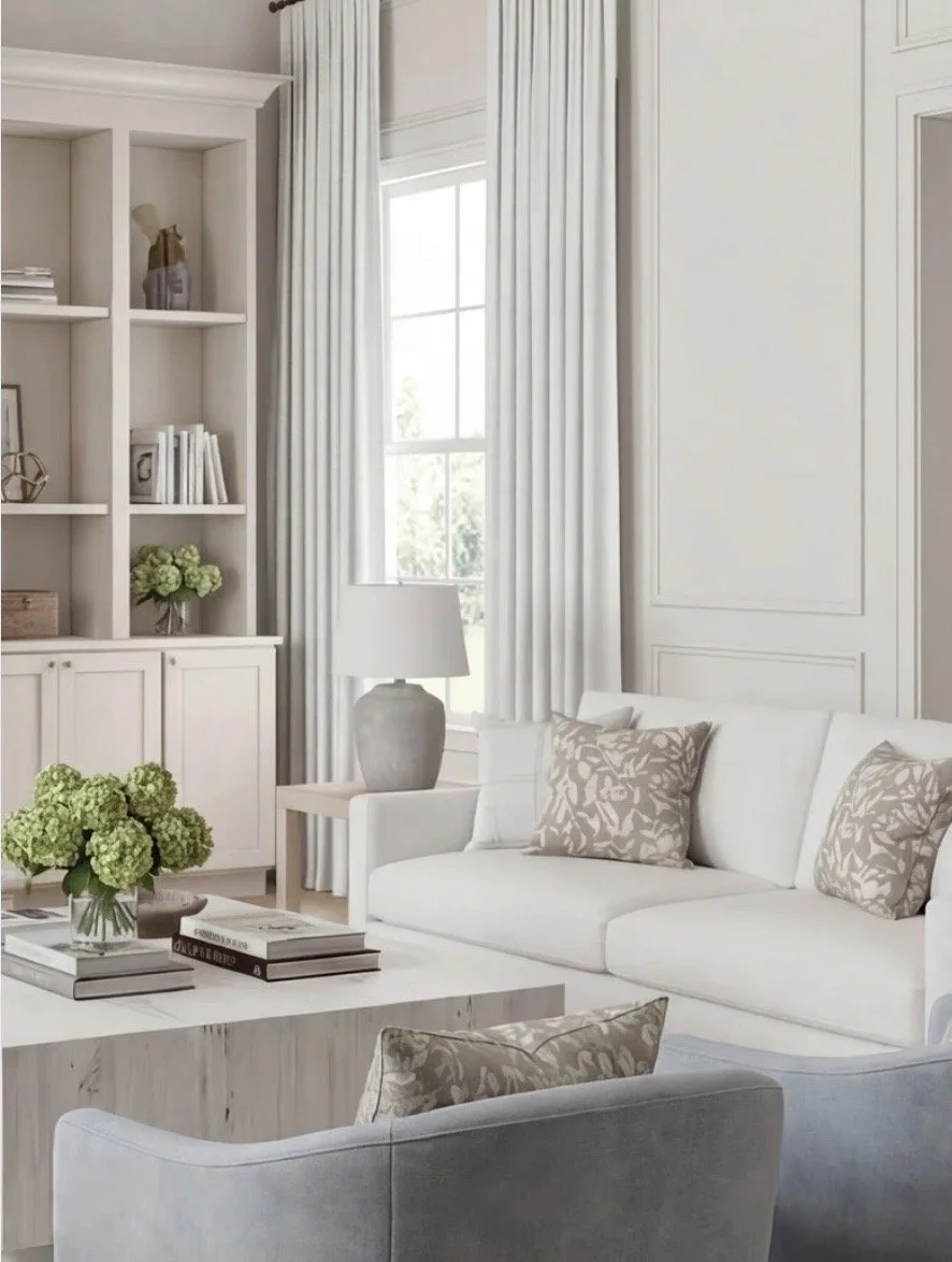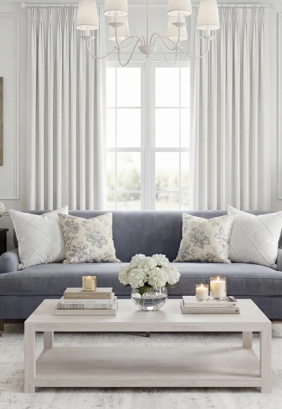 A deeper dusty blue adds richness while still pairing beautifully with creams and taupes.