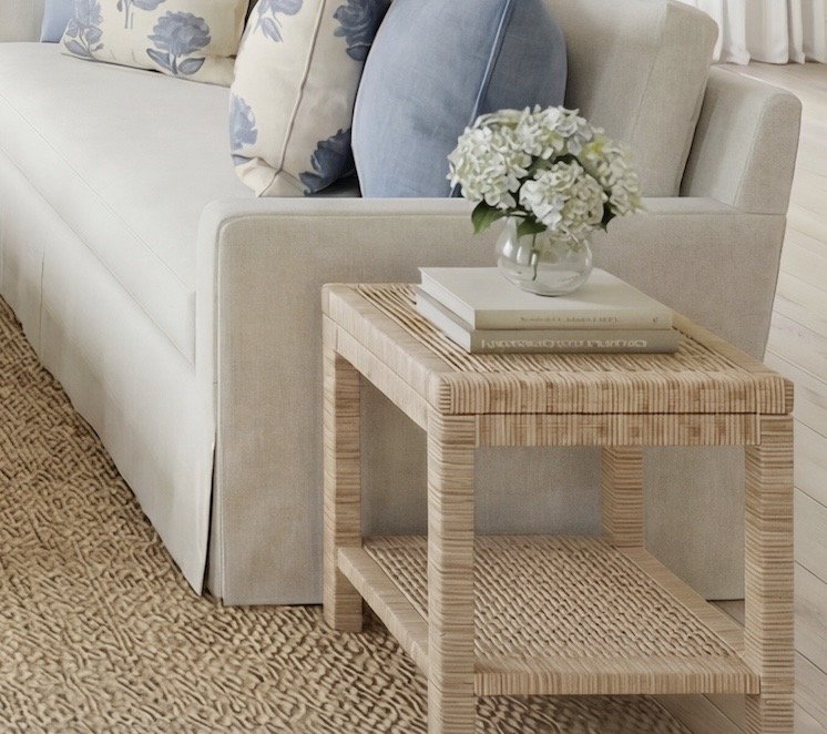 A soft blue floral is an easy way to introduce color while keeping the overall palette neutral and timeless.